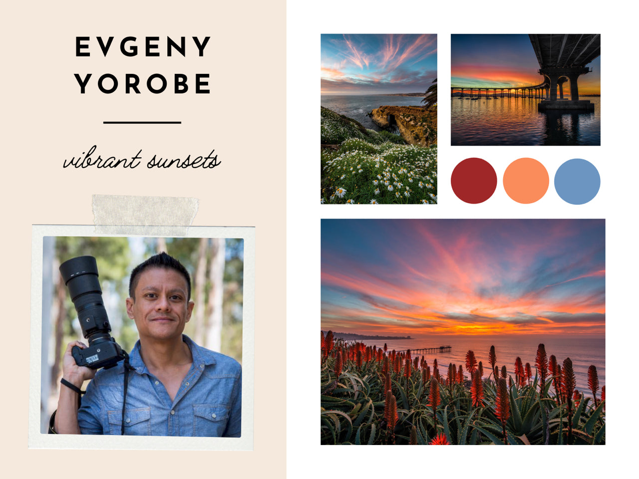 Evgeny Yorobe's collection highlights San Diego's beauty like no other. A San Diego native, he has a knack for capturing his hometown's famous landmarks complemented by the most vibrant sunsets.