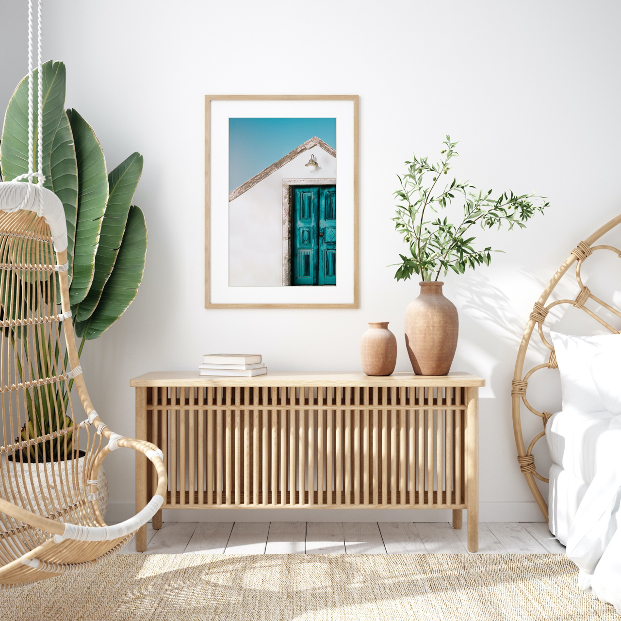 Bring a pop of color and Mediterranean charm to your space with “Entryway,” a fine art photograph by John Scanlan. This striking image features a vibrant turquoise door set against crisp white stucco, capturing the timeless beauty of Greek island architecture. The minimalist composition and bold color contrast make it a perfect focal point for modern or coastal-inspired interiors.