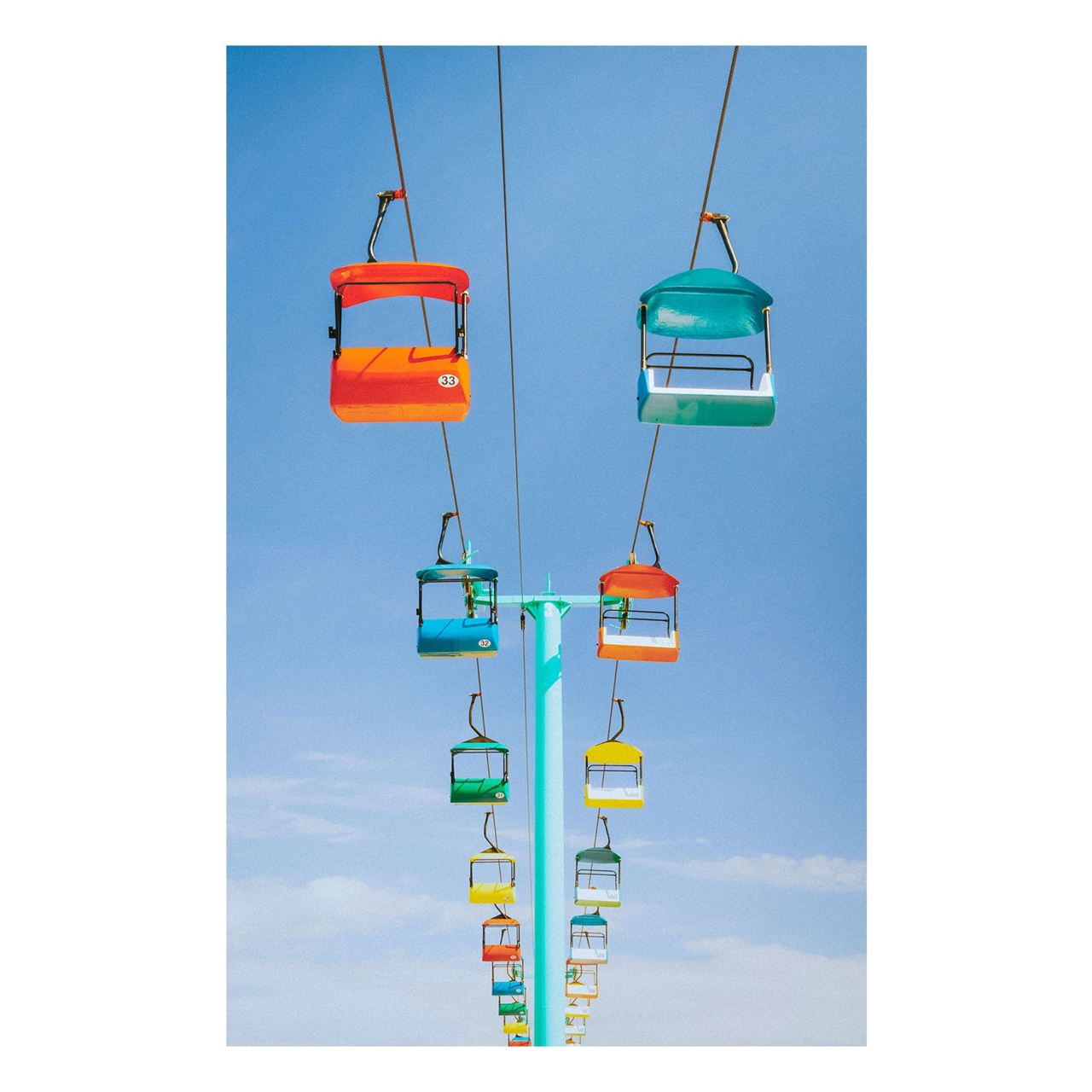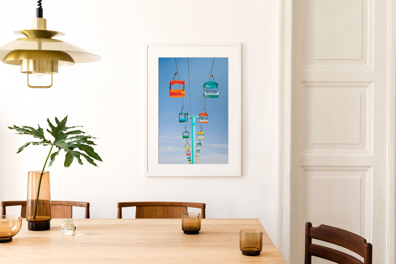 Add bold summer color to your walls with "Lift Me Higher", a fine art photograph by John Scanlan. Featuring red, turquoise, and yellow aerial trams set against a clear blue sky, this vibrant image brings a playful pop art aesthetic to any space.