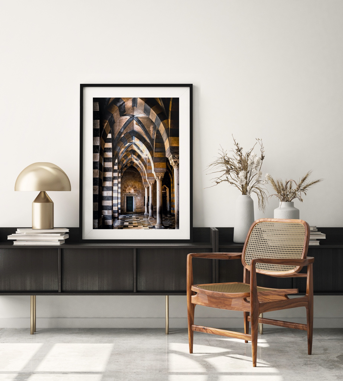 Sant' Andrea is a fine art architectural photograph by John Scanlan, capturing the dramatic black and gold archways of a historic cathedral along Italy’s Amalfi Coast. The bold geometry and rich tones evoke centuries of artistry and craftsmanship, offering a timeless sense of grandeur.